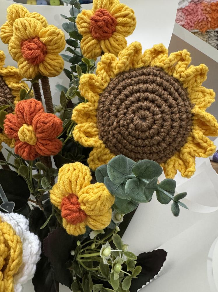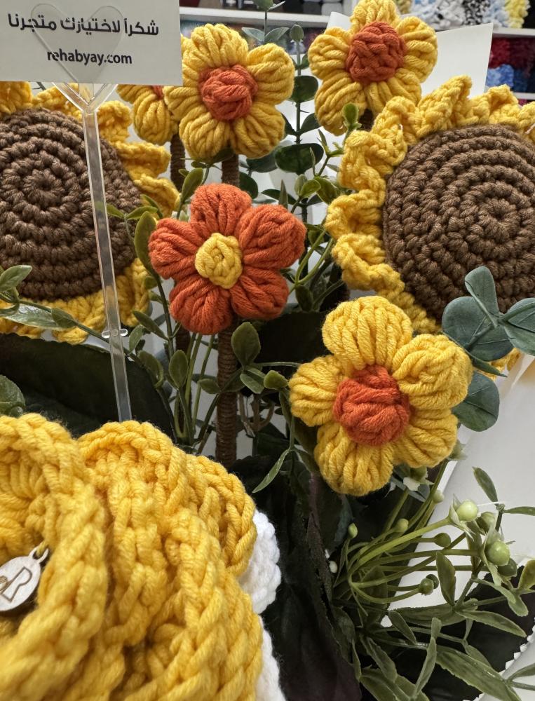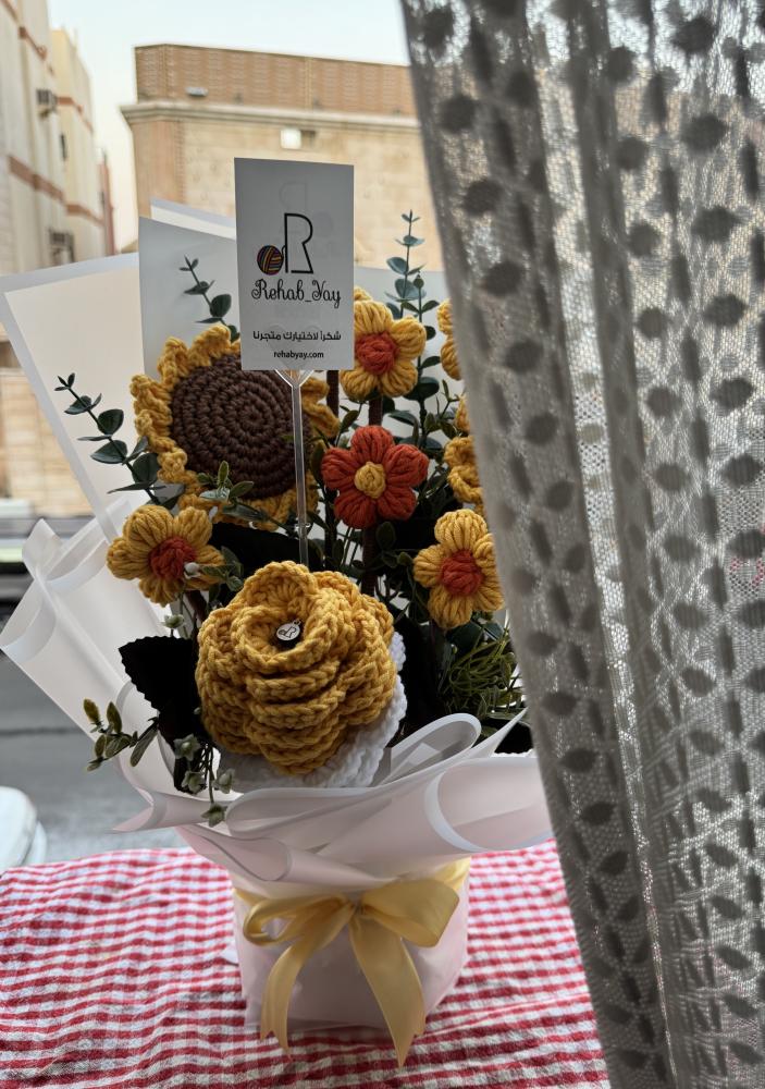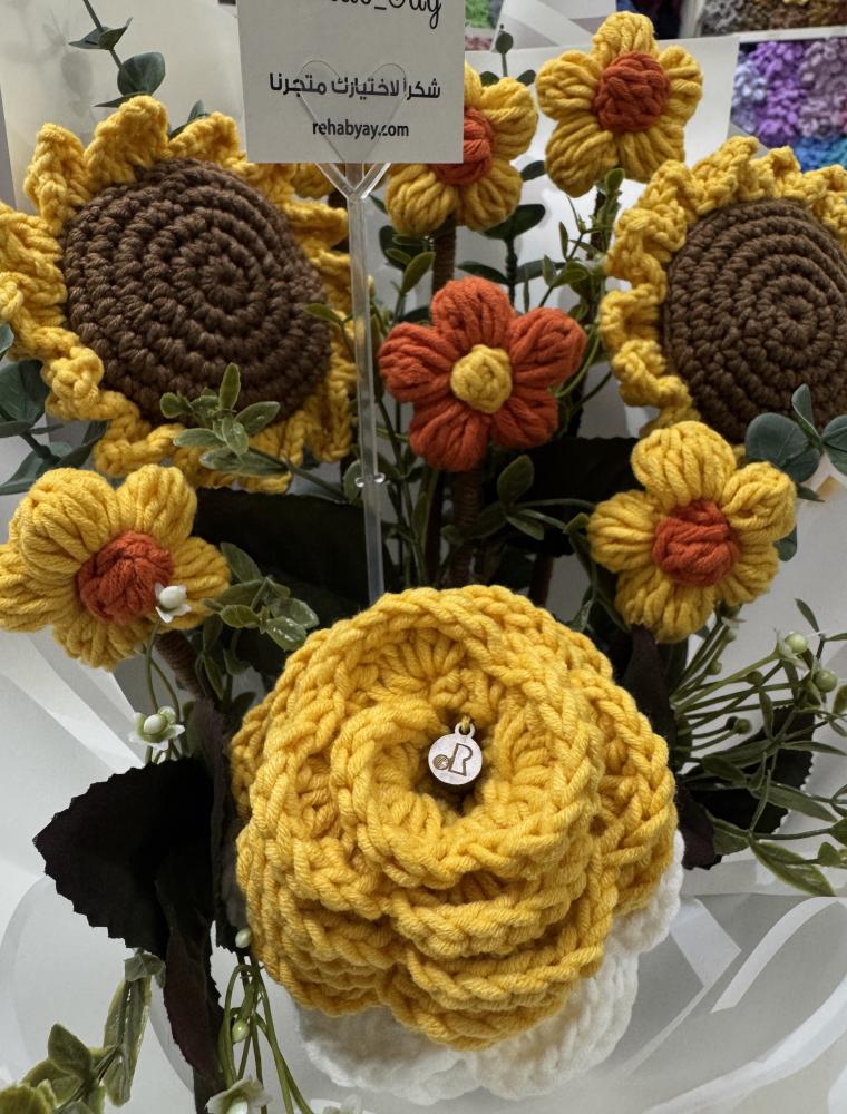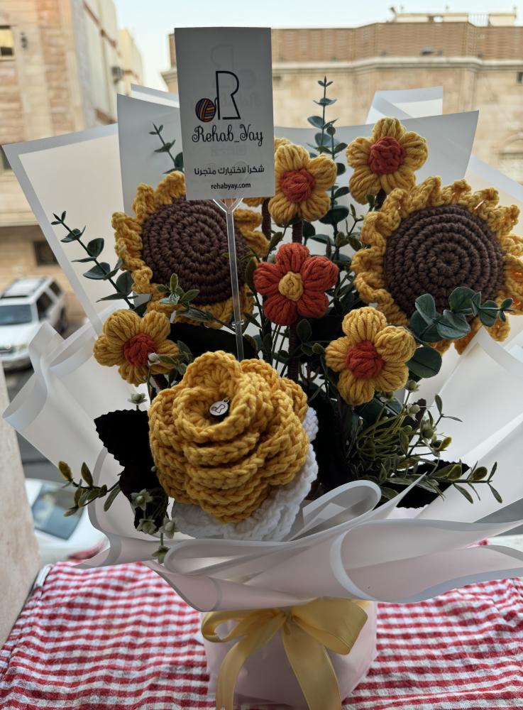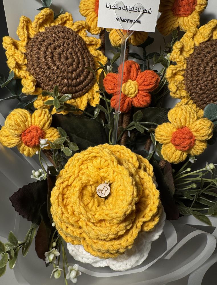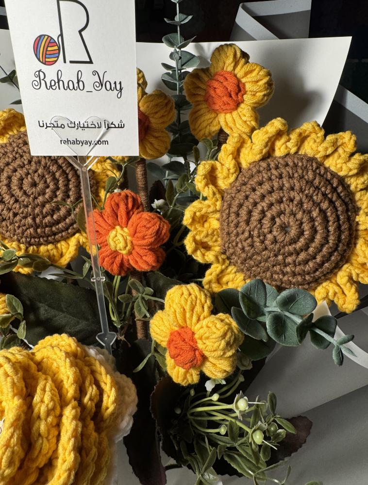 🌻🌻🌻“باقة زهور مصنوعة يدويًا بخيوط الكروشيه، تضم مجموعة من زهور عباد الشمس الجذابة وأزهار ملونة بألوان متناغمة ودافئة. تأتي الباقة بتصميم راقٍ وأنيق، مغلفة بعناية لتكون هدية مثالية تضيف لمسة فنية وجمالية لأي مناسبة.”🧡👌🏻🌻🌻🌻