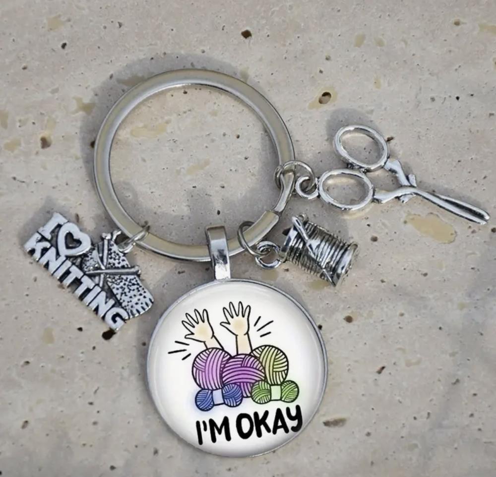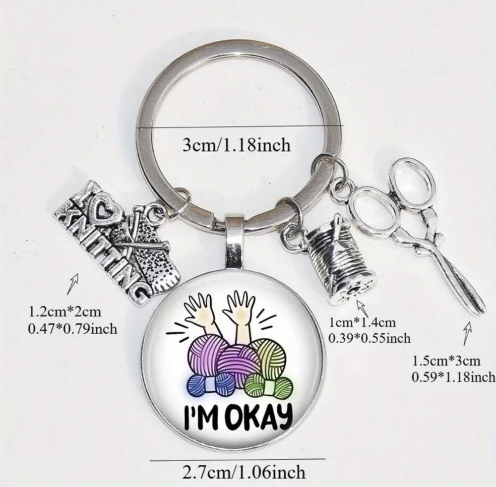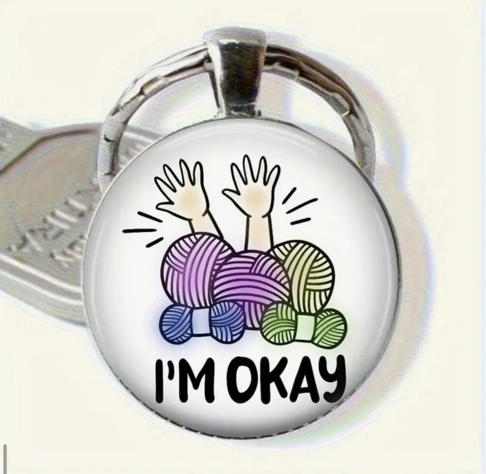 - تعليقة مستديرة مكتوب عليها “I’m OKAY” مع رسمة ظريفة تمثل الواقع اليومي لكل هاوية خيوط