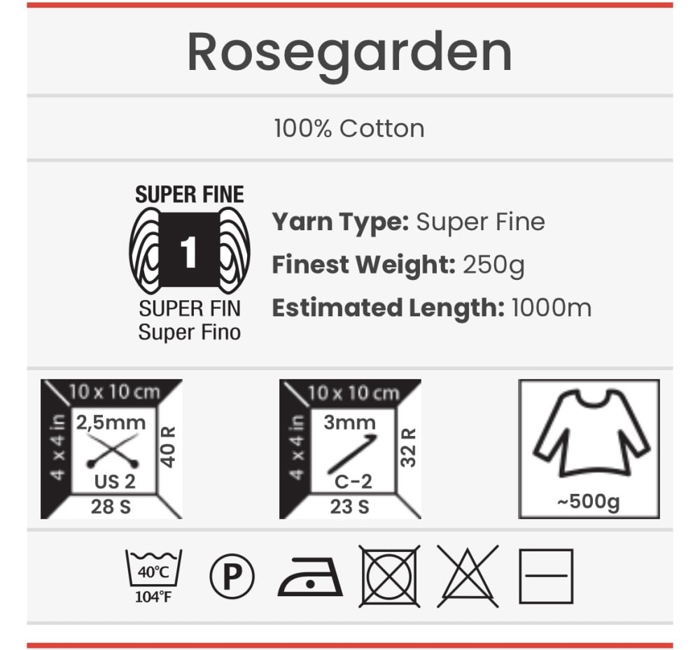 ستكون سلسلة Rosegarden الجديدة تمامًا من YarnArt أمرًا لا غنى عنه لمشروعاتك الصيفية بمحتواها القطني بنسبة 100%. لها ألوان مختلطة في كعكة ولها شكل ملتوي. يتميز Rosegarden بملمس ناعم لذا فهو مناسب لمنتجات الحياكة والكروشيه الصيفية مثل الفساتين والبلوزات والتنانير والشالات والإكسسوارات. يمكنك تفضيله على منتجات الأطفال والرضع بسبب محتواه الطبيعي. يبلغ طول كل كرة كعكة 1000 متر، لذا فإن كرة واحدة تكفي لحياكة متوسطة الحجم.