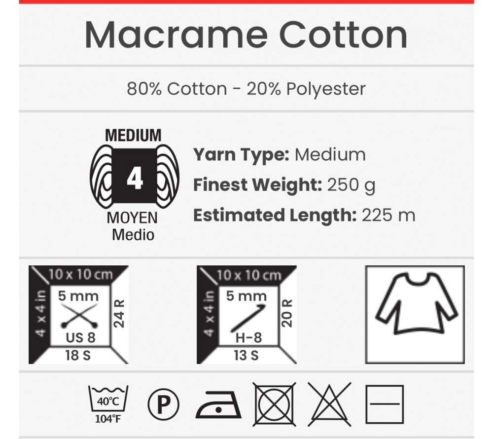 يارن ارت مكرمية قطنYarnArt Macrame Cottonالخامة: 80٪ قطن 20٪ بوليسترالوزن: 250 غالطول: 225مابرة: 5MMالصناعه : تركيهتصفح المزيد من منتجاتنا